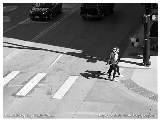 So! When Pat and I were at the MCA Denver a couple of weekends ago (see yesterday's post), I found myself repeatedly drifting to an upper floor window overlooking 15th and Delgany. As I sat on the bench, I idly photographed people through the thick glass as they crossed the street. Some observations: it's interesting how folks will diligently wait for the "walk" signal before they step foot off the curb, even if there are no cars coming. It's also interesting how quickly they will all fall into lockstep, like soldiers. Another thing I noticed was how, if they are strangers, they will find strategies to distance themselves from one another once they commence crossing the street. Some will walk more quickly, while others will hang back; some stare ahead at a distant point, while others look down. Anything to avoid a semblance of contact. And finally, the random patterns they make when viewed from above, and the deep shadows cast by the afternoon sun, were interesting as well. I only allowed myself to take one photograph of each group, and I deleted none of the images. Here are all the photos I took, in chronological order.