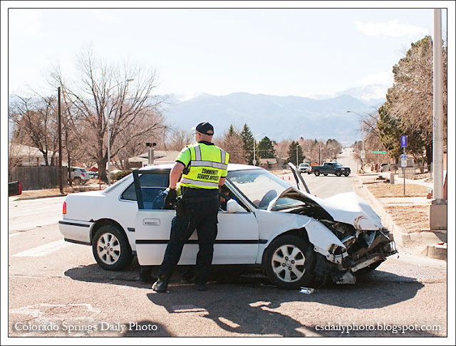 Pat had a truly weird experience last week. He was driving west on Pikes Peak Avenue where it intersects with Chelton Road when he heard a loud screech and saw a GMC Yukon plow into a small white sedan. Car parts flew everywhere. Ever the concerned citizen, Pat pulled over his car to make sure that everyone was all right. A man emerged from the passenger seat of the white car, staggered around for a moment, then suddenly started running straight toward Pat. Of course this was very puzzling for Pat, but puzzlement soon gave way to alarm when two police officers rounded the corner on foot, chasing after the guy! Only a few feet from Pat's car, they tackled the fleeing man in someone's front yard and handcuffed him. Crazy! Pat came home pumped full of adrenaline and told me the whole thing, so naturally we drove back over to the scene of the accident so I could get pictures for the blog. I got a couple of snaps through the car window as we cruised past. It turns out there was a third small car involved and it was just as crushed as the white car (the ginormous Yukon definitely fared the best), but I didn't get a picture of it. It looks like no one was hurt but I'm sure it ruined everyone's day -- especially the guy who's sitting in the pokey right now.